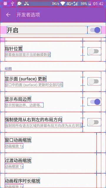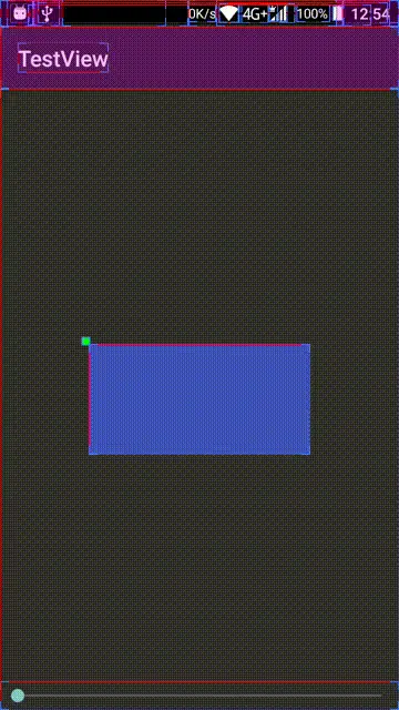 但如果说这个坐标是指left,top,right,bottom呢,那就不对了,为什么呢?因为经过我们刚刚对ViewPropertyAnimator的源码分析,知道了位移动画最终也只是调用了RenderNode的setTranslation方法,而left,top,right,bottom这四个值并没有改变。 这时候可能有同学就会说了:我不信!既然没有真正改变它的坐标,那它接受触摸事件的区域怎么也会跟着移动呢? 好吧,既然你不信,那我们来做个试验就知道了,这次需要到 设置 - 开发者选项 里面把显示布局边界这个选项打开: