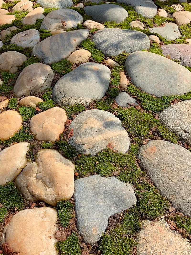 然后上周六去了附近的大学里赏樱花,回来的途中在一片荒废的树影里无意中发现了好多苔藓,当时心想我院子里的石头缝隙中见刚好缺点绿色,所以我就挖了一篮子苔藓带回院子,并且立马就给铺上了。