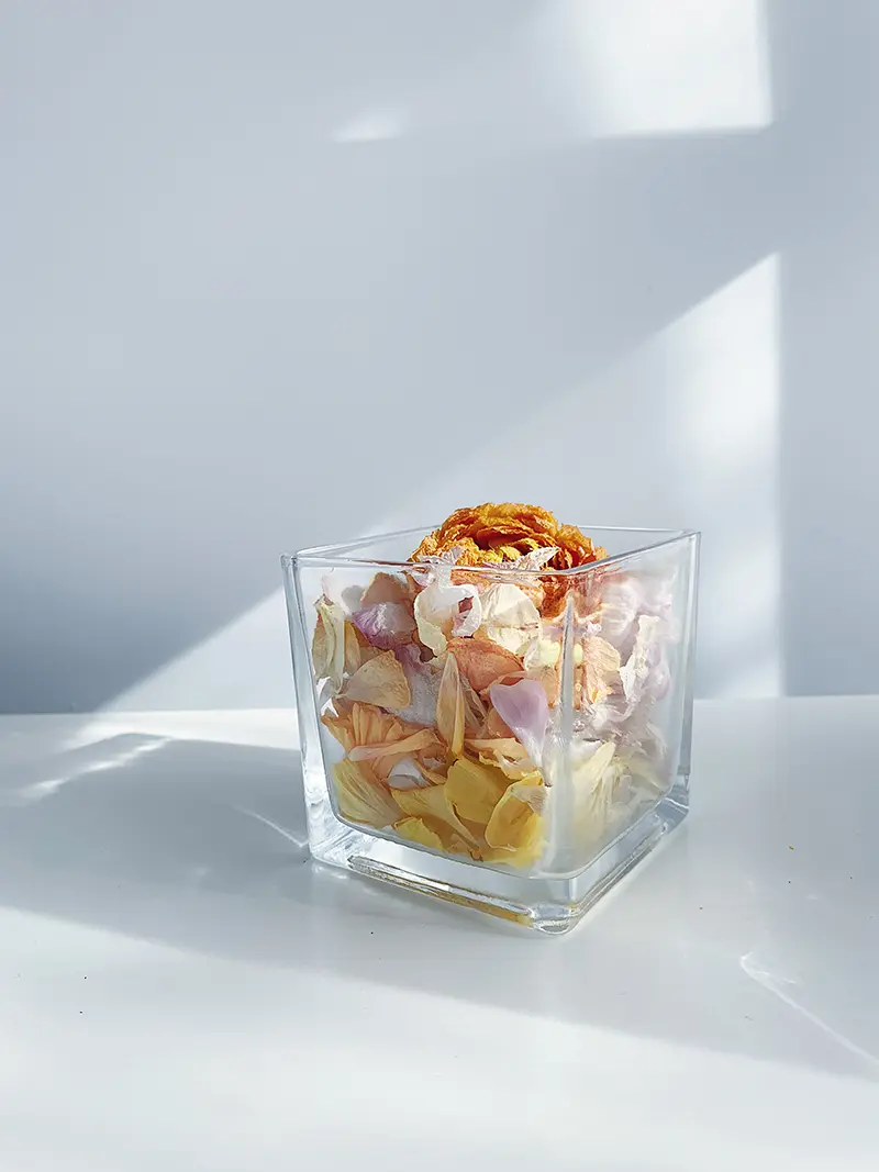 我看到很多洋牡丹的花都凋谢了,但是那些花瓣扔了吧又很可惜,所以我就找了个玻璃杯子把它们装了起来,放在了窗户边的货架上。