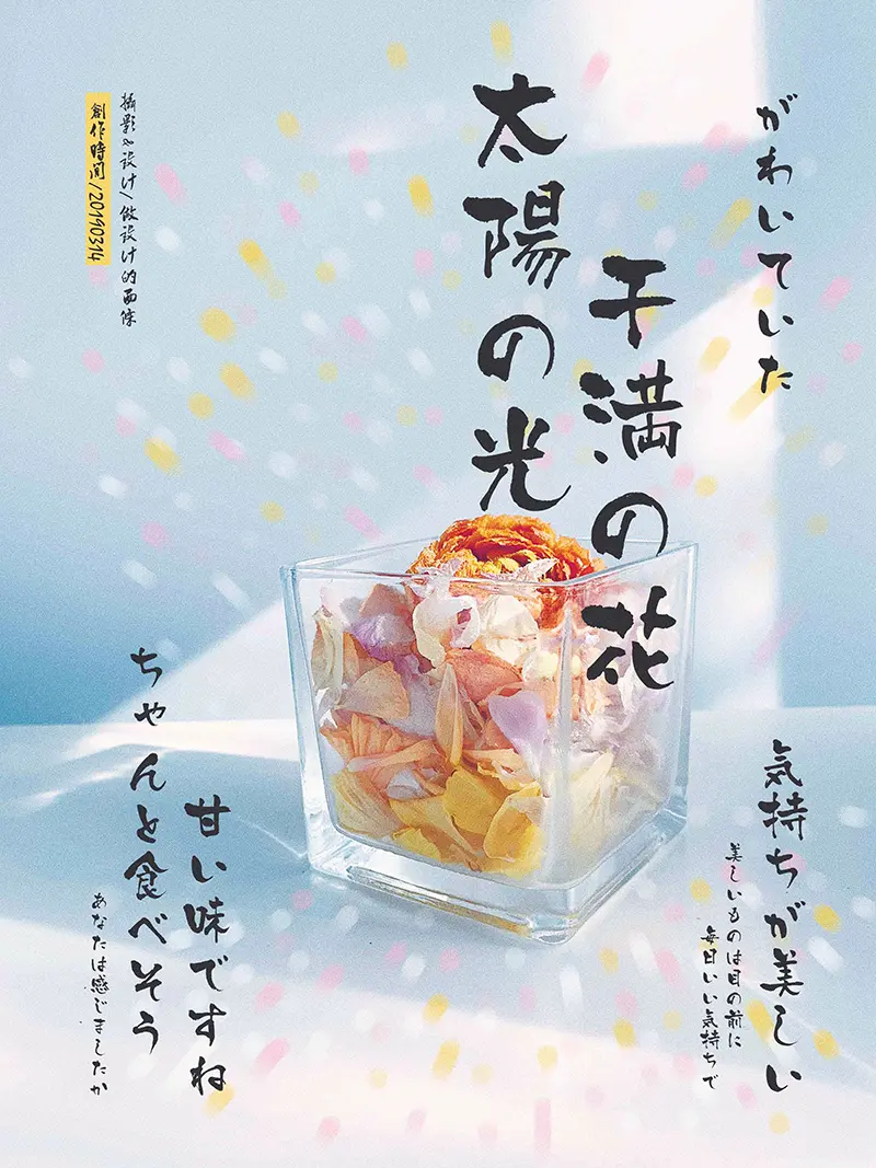 没想到,最后看到照片好好看,特别像一杯盛满了阳光的花瓣冰淇淋,我把照片发到朋友圈大家也都说很好看,所以一不做二不休,做成海报吧!~