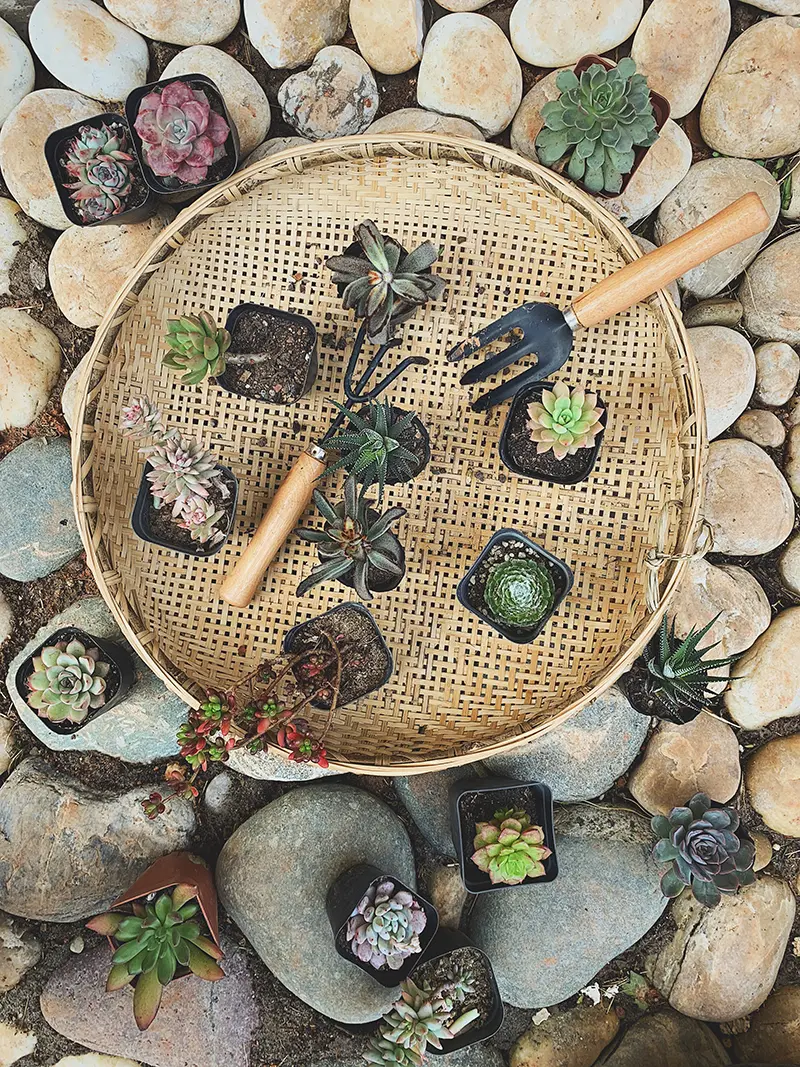 这就是为什么背景的石头路被我处理成了暗色调,这也是为什么我会在拍照的时候故意放了一些多肉在石头缝隙里,这也是为什么我故意让一盆多肉伸出了竹编的篮子,这也是为什么我在最后海报完工的一刻给它画上了一条弯弯绕绕的线条。