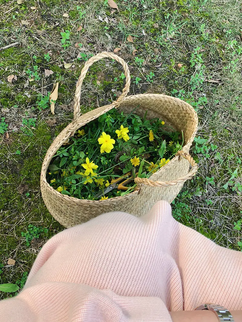 这张照片是我11月份在深圳学花艺的时候拍的,那天我是要做一个水滴状的手捧花,然后需要非常多的花材,我就去外面院子里摘了很多野花,野花是用一根根铁丝穿起来的,然后外面还要用绿色的胶布绑起来,看起来会比较好看。