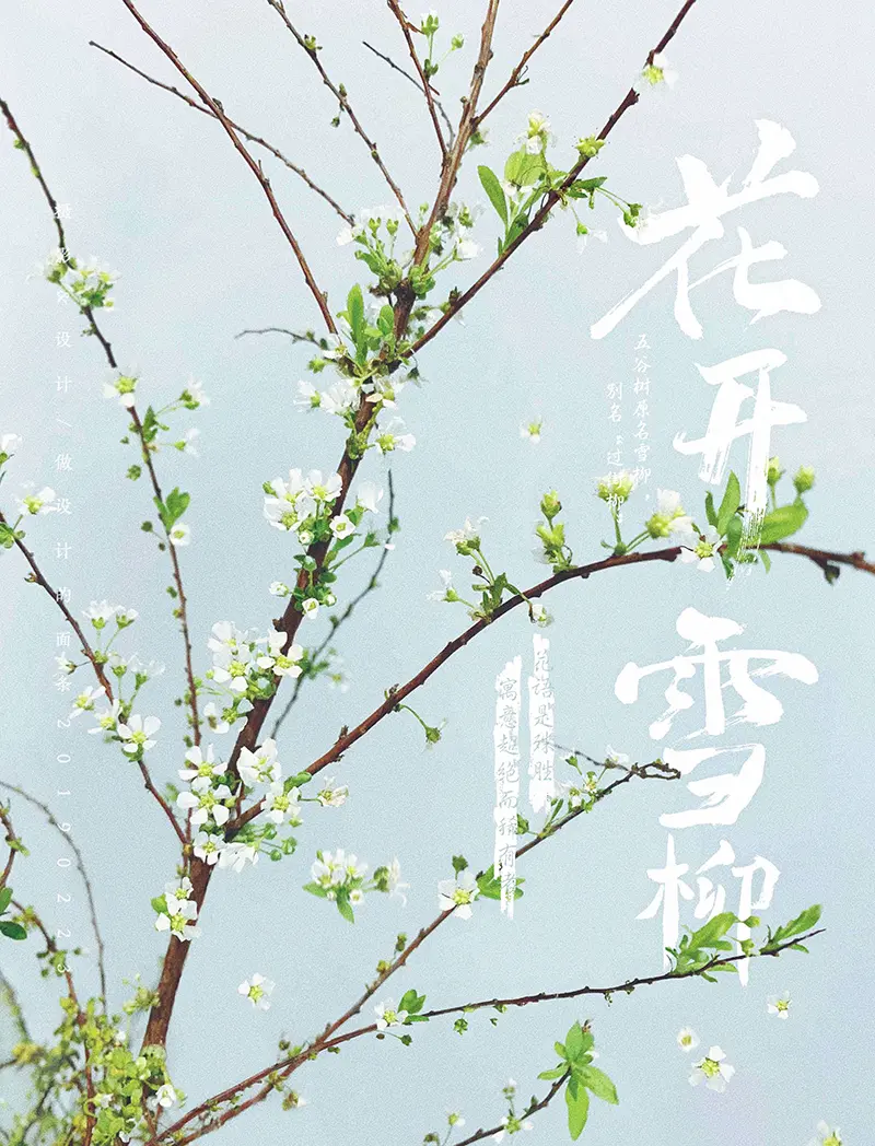 我就给她们说:“你看雪柳的形态,有非常多的纤细的枝条绕来绕去的,所以你可不可以给我写出那种带一点潇洒又带一点女性柔美气质的毛笔字出来?并且字不能写的太瘦高了,因为我的画面有点杂,所以文字不能看起来太细碎,同时还需要能体现出一点傲骨的气势”。(啊,这个甲方要求也太多了吧!~)