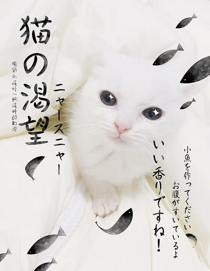 然后我拍的好多照片基本都是白底的,或者是比较简洁的,而且有时又比较有趣味,所以第一感觉就是这张喵咪照片很适合做成日系海报,自然而然也就配了一些日文上去。