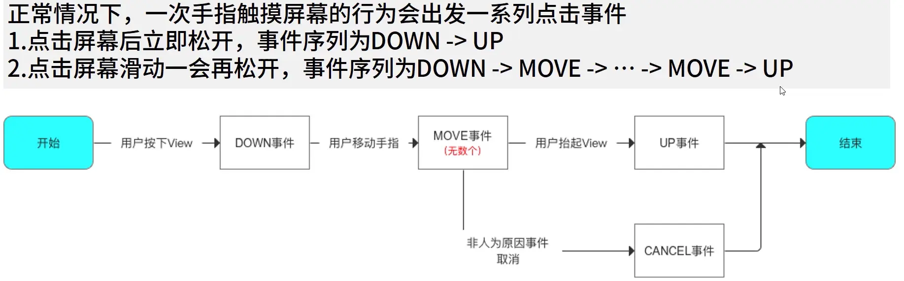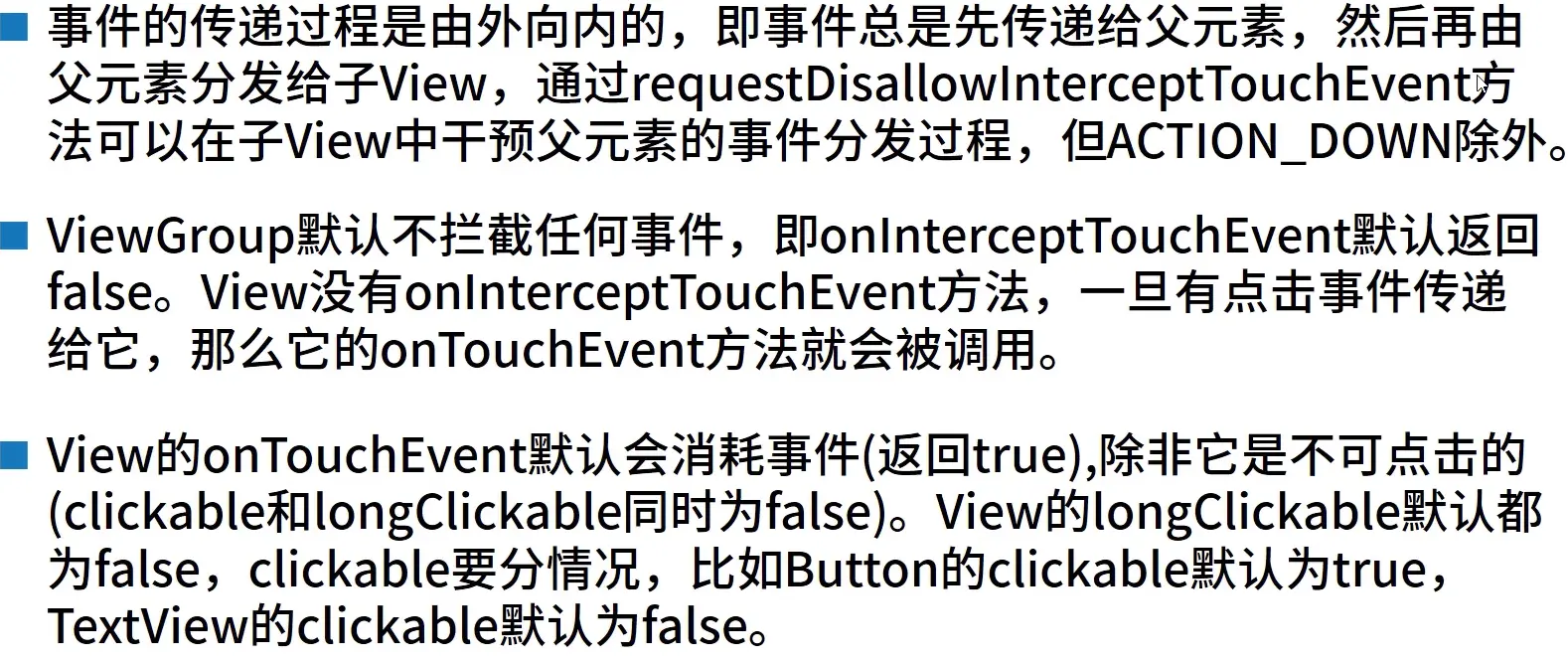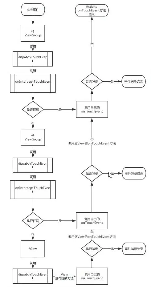 首先事件分发之后由activity分发到达根布局ViewGroup,之后会调用ViewGroup的dispatchTouchEvent()方法,dispatchTouchEvent()方法中通过调用ViewGroup自身的interceptTouchEvent()方法来判断是否对时间进行拦截,如果拦截,则调用自身的onTouchEvent()方法,onTouchEvent()方法判断是否消费事件,如果消费则事件消费结束,如果不消费,则交给activity的onTouchEvent()方法进行处理;如果不拦截,则事件会交给子View处理,如果子View也是ViewGroup的话,流程跟以上一样;如果View没有子View的话,则会调用View的dispatchTouchEvent()方法,View中是没有拦截方法,所有会直接调用自己的onTouchEvent()方法处理事件,如果事件被消费则事件消费结束,如果View没有消费事件,则交给它的父ViewonTouchEvent()方法处理,如果父容器都不处理,最终会调用activity的onTouchEvent()方法。