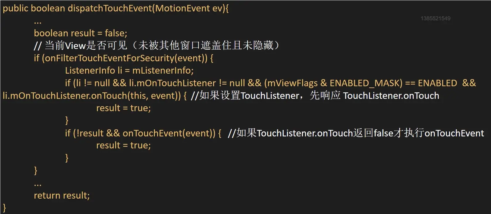 View的dispatchTouchEvent()事件分发的伪代码实现: