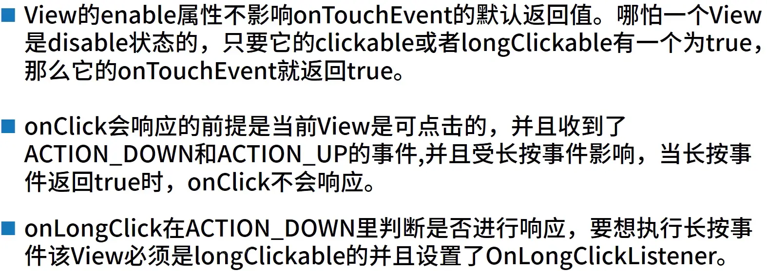 由吸上伪代码可以判断,当View设置了TouchListener的时候,会先调用TouchListener的onTouch()方法,如果onTouch()方法返回true,则不会执行View的onTouchEvent()方法,如果返回false才会执行onTouchEvent()方法。TouchListener、onTouchEvent、ClickListener的优先顺序是:TouchListener>onTouchEvent>ClickListener.