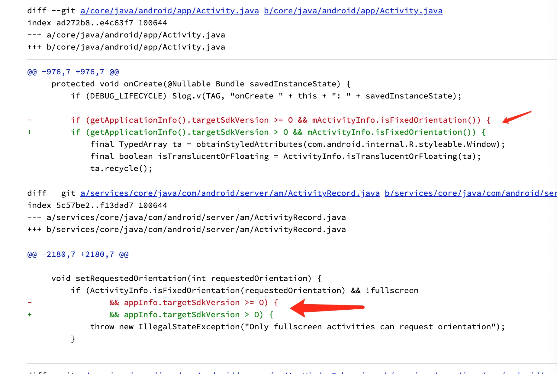 关于第一个问题,我继续查看了Android8.0的源码,以及它的提交记录发现在这个提交不久之后,Android开发人员又有了新的提交,在sdk为26时,放开了限制。
