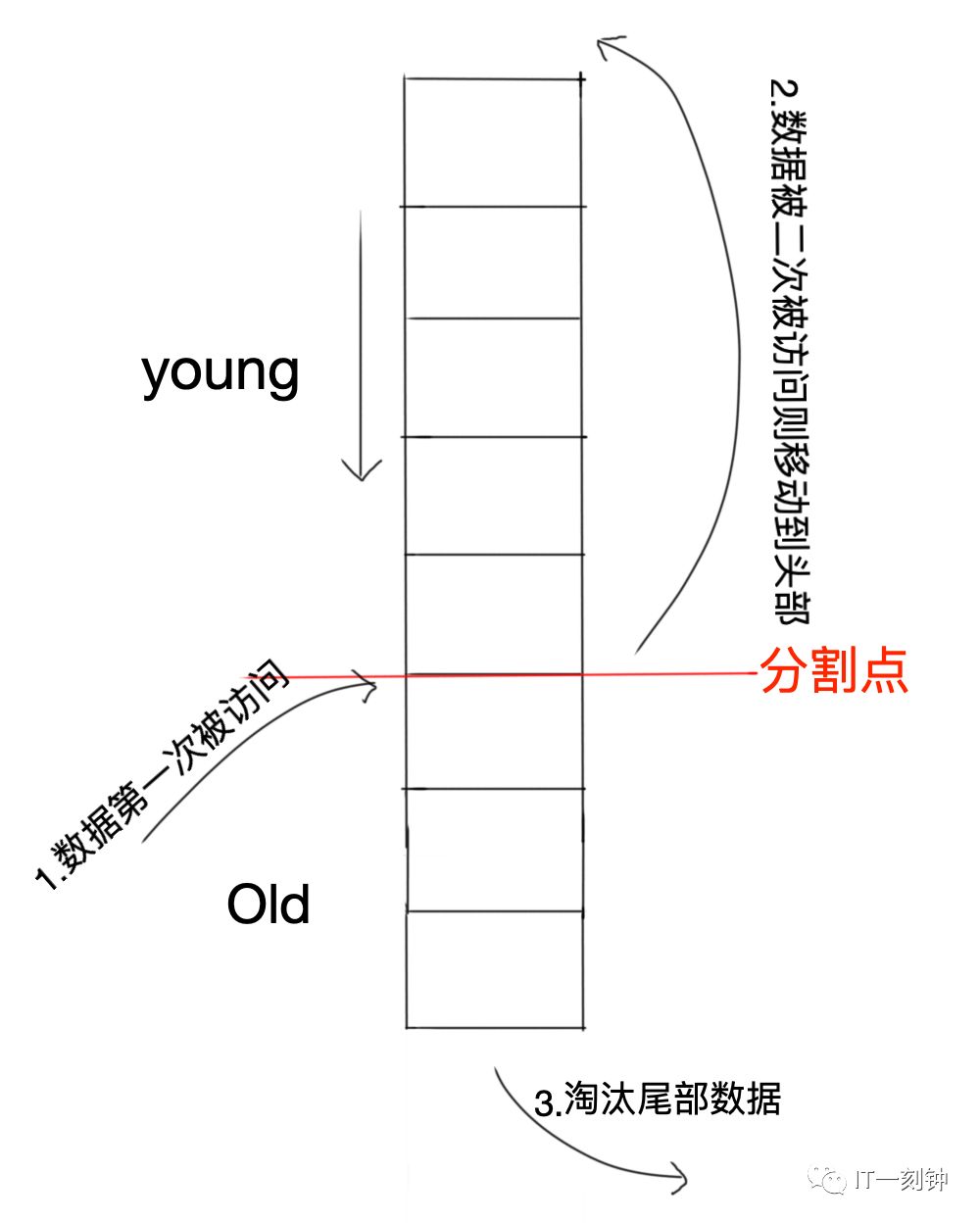 emmmm…这个名字其实是我取的,大概是这种算法还没有被命名?当然,这是一个玩笑话。 我是在mysql底层实现里发现这个算法的,mysql在处理缓存淘汰时是用的这个方法,有点像URL-Two queues的变体,只是我们只需要维护一个队列,然后将队列按照5:3的比例进行分割,5的那部分叫做young区,3的那部分叫做old区。具体是怎么样的请先看我把图画出来: