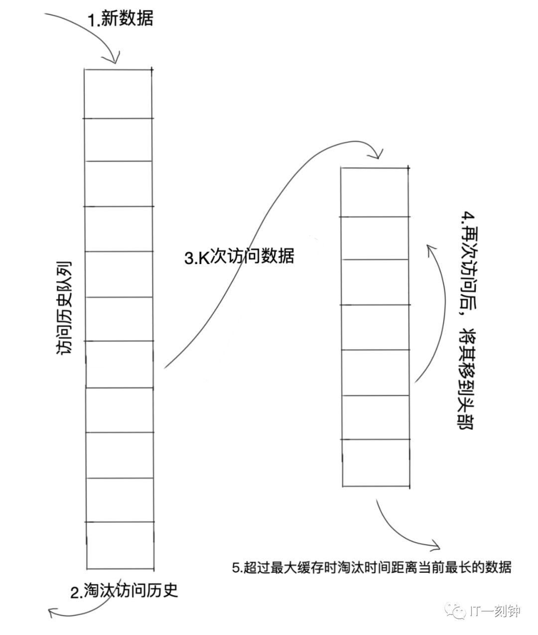 当数据访问计数大于等于K次后,将数据从历史访问队列中删除,更新数据时间戳,保存到缓存队列头部中(缓存队列时间戳递减排序,越到尾部距离当前时间越长);