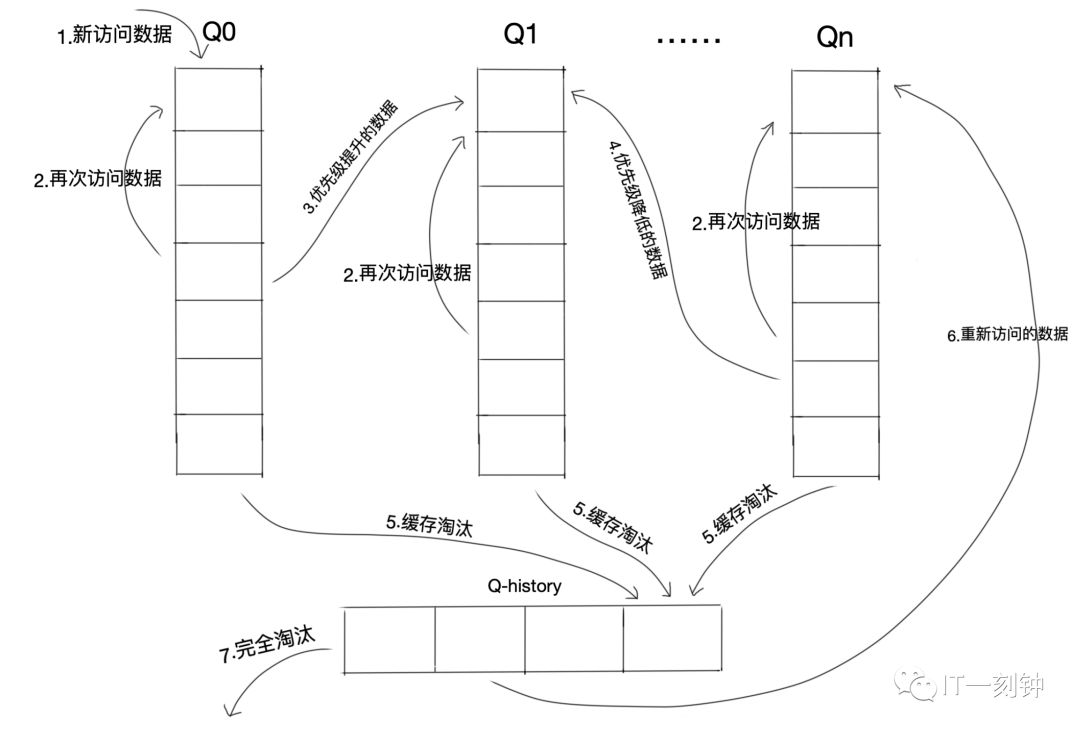 Multi Queue算法根据访问频率将数据划分为多个队列,不同的队列具有不同的访问优先级,其核心思想是“优先缓存访问次数多的数据”。Multi Queue算法将缓存划分为多个LRU队列,每个队列对应不同的访问优先级。访问优先级是根据访问次数计算出来的,例如:Q0,Q1….Qn代表不同的优先级队列,Q-history代表从缓存中淘汰数据,但记录了数据的索引和引用次数。