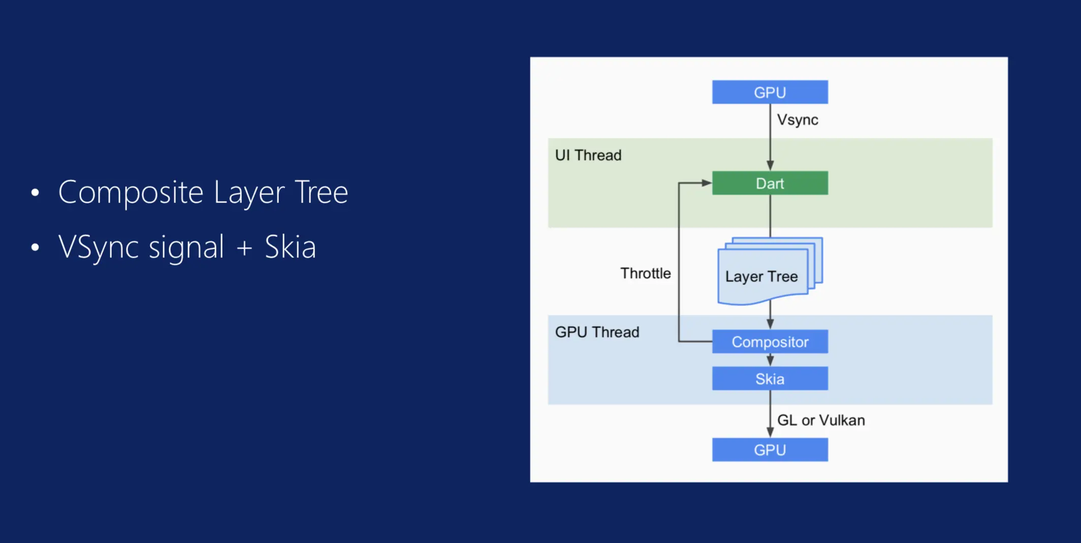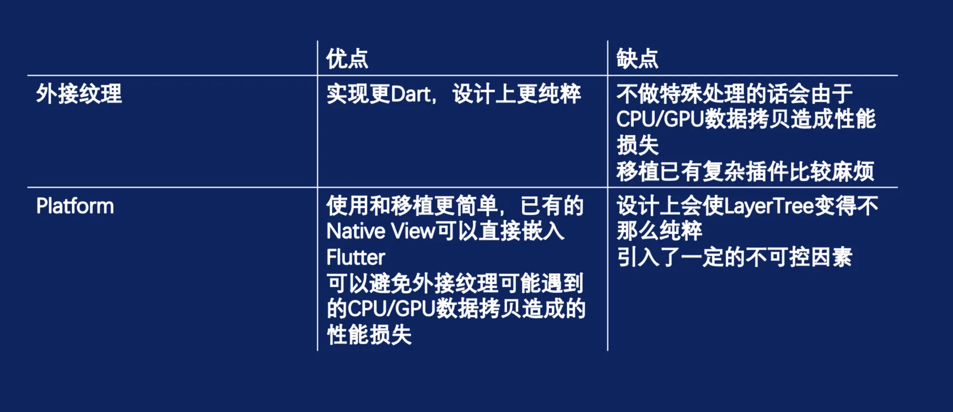 美团看中Flutter就是看中了它的性能,它有自己的一些UI线程和GPU的线程,它有自己独立一套的渲染逻辑,它脱离了Native这一侧的局限。