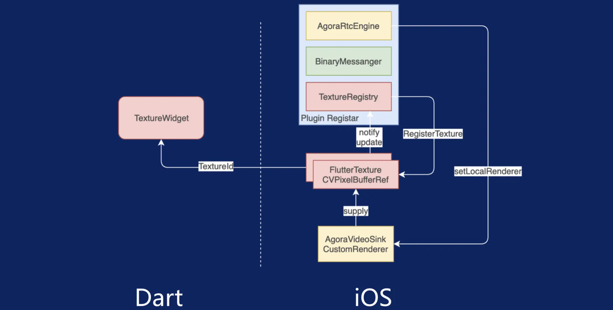 在 Flutter 里有一个组件叫 Video Player,其中有一个 Texture Widget,我们可以通过 Native 端来提供视频数据给这个 Texture,然后通过它来进行渲染。以 iOS 为例,iOS需要提供CVPixelBufferRef,它可以将渲染出来的数据供给Texture Widget,然后Texture Widget就可以把你提供的这些数据显示出来。在我们传输数据的时候会需要将其与 TextureID 绑定,这样一来,可以在同一个界面上出现多个 Texture,也就是说能显示多个视频通话窗口。在其中,声网 SDK 的 AgoraVideoSink 接口里可以提供一个回调,这个回调会把它收到的所有视频数据通过你想要的格式传给 Texture。