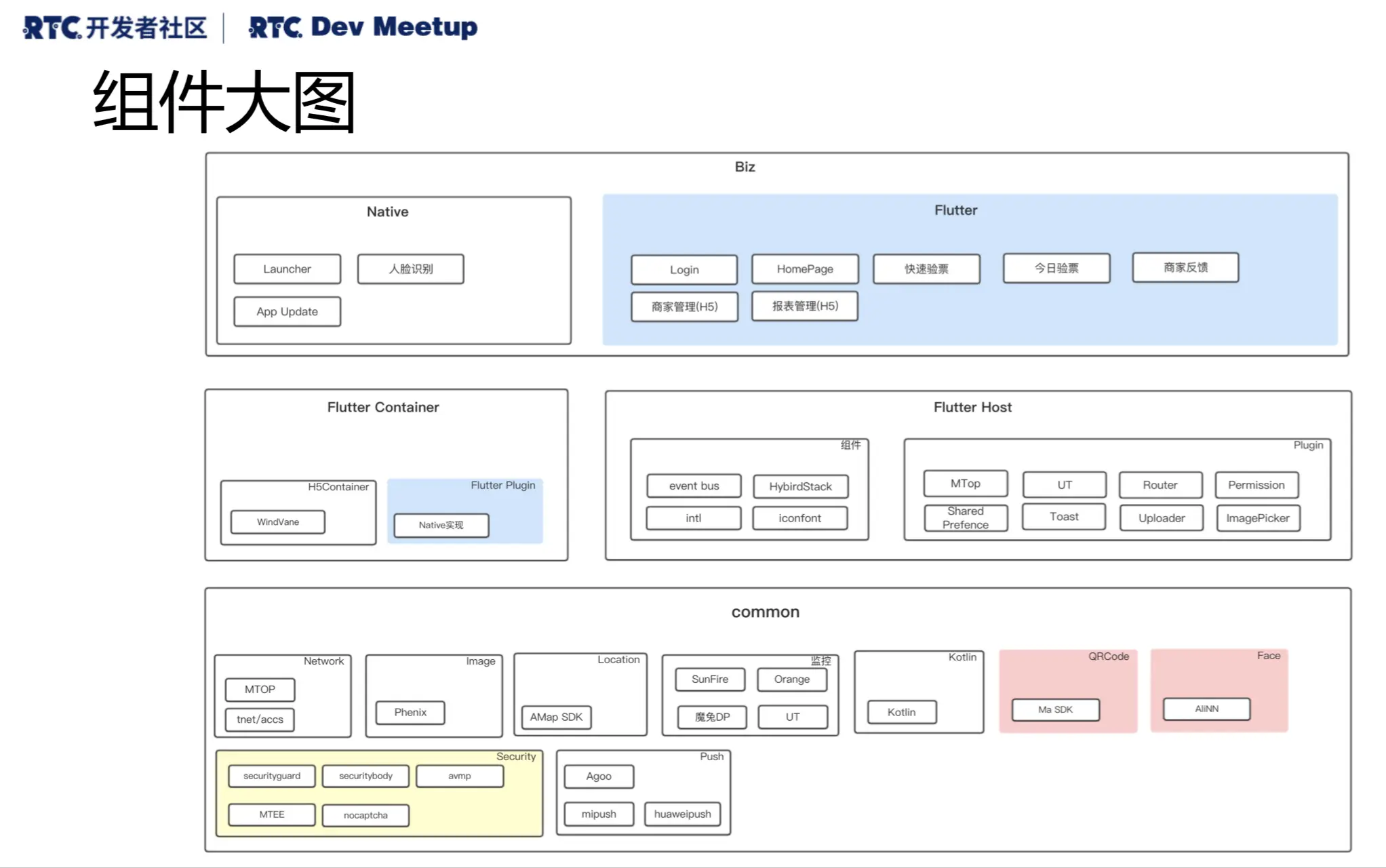 阿里现娱无线端基础线负责人王璟瑤来自大麦网。大麦网采用Flutter在一个独立的APP上进行了落地。他的分享主要分成四个部分,一是大麦网的落地情况,二就是组件化集成,包括集成、编译构建、调试方面的经验,第三是Flutter作为开发的基础能力,第四是高可用部分。他重点讲解了组件化集成部分。