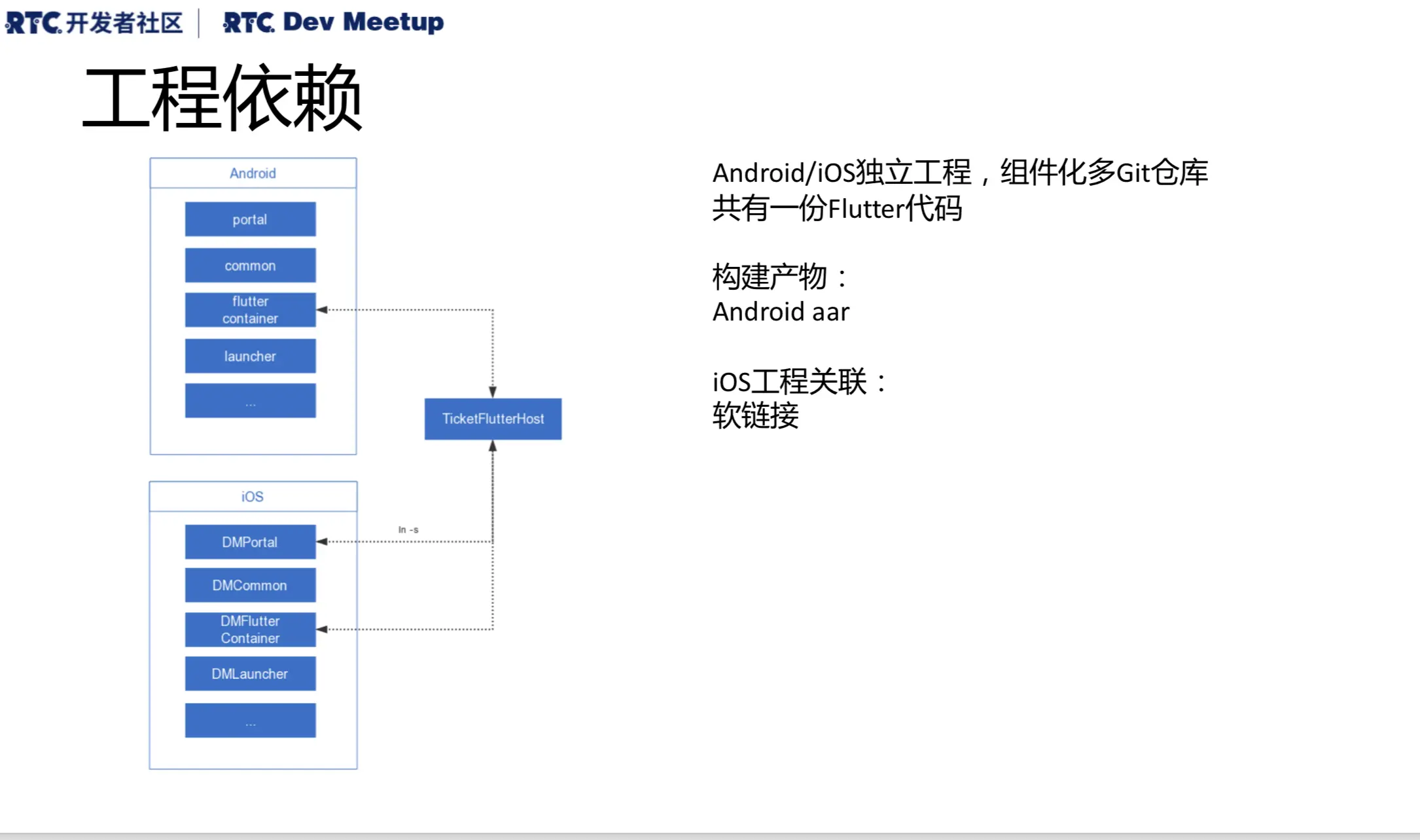 工程依赖可以看到两个工程组件化的形式,我们的根工程基于上面安卓叫 Portal,iOS是 DMPortal,分别有对应的 Common 和 Flutter container、Flutter Host,外面是这个 Host 编译完成之后把相关的产物打包提交到 Flutter Container 去。iOS 是基于软链接跟原来的工程做并联,Android 则相对复杂一些,都是在命令行里完成的。