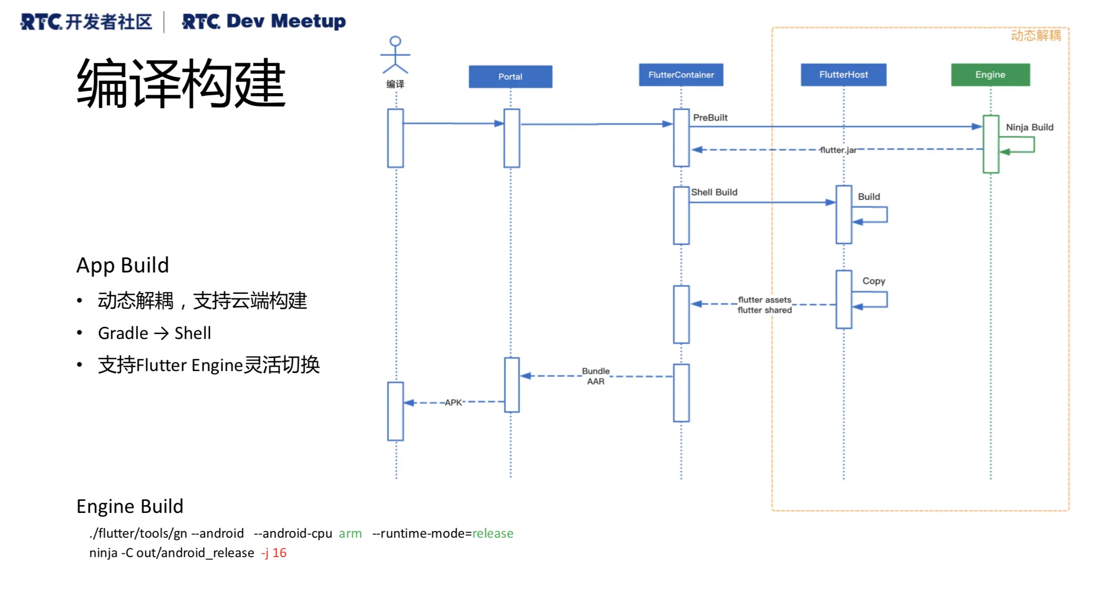 如上图是我们优化之后的编译构建模型。因为我们要解决能运行的问题,所以我们需要编译Engine。以Android这边举例子的话就是我们可能会改变原有标准工程上依赖于Gradal的实现,大量的逻辑会通过脚本的方式做构建,然后做Engine的拷贝,最终我们会打包出一个Bundle AAR,然后再完成整个工程的构建。