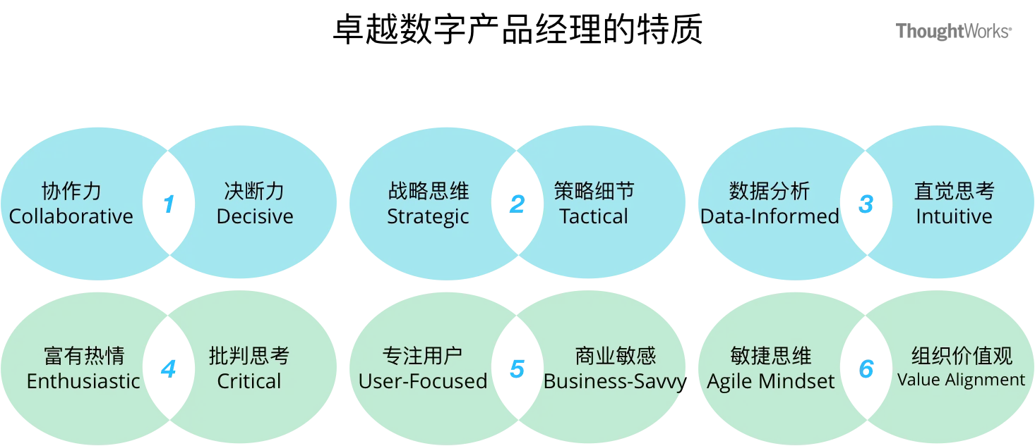 我们都知道“冰山模型”中,冰上面的是知识、技能、经历,是比较容易快速习得的,而冰上下的部分,如价值观、态度、个性特质、内驱力、长久形成的思维和行为模式,则决定了是否可以产生卓越绩效。比如前面技能实例化部分所给的示例,表面上所需要的行业和市场分析、商业运作的技能,背后是分解问题、信息收集、沟通对话和信息提炼,那对应的人的潜质可能是兼具数据分析和直觉思考、商业敏感、决断力强。所以如果组织在进行转型,有计划或正在创建一系列数字化产品,可以去选择更具“卓越产品经理”潜质的人才。《使用Scrum进行敏捷产品管理》一书的作者Roman Pichler曾经写了一篇文章,认为卓越产品经理应该具备5组特质: