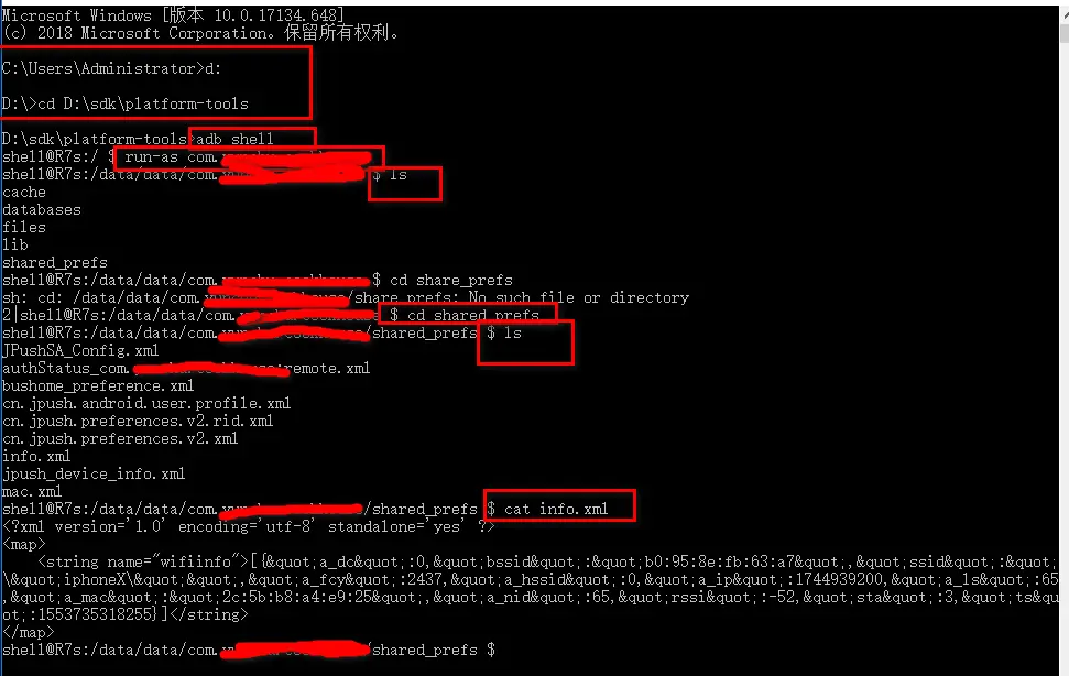 Android如何查看安装包下缓存的文件内容 爱吃荆芥 2019-03-28 660 阅读1分钟 首先需要命令行切换到platform-tools目录下,因为要使用到adb命令;adb shell;run-as com.xxx.xxx(run-as之间没有空格);ls;cd 目录名;ls;cat 文件.扩展名;