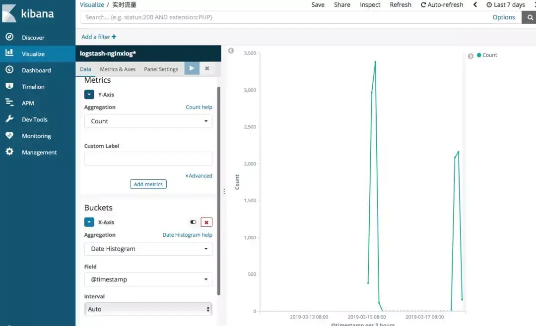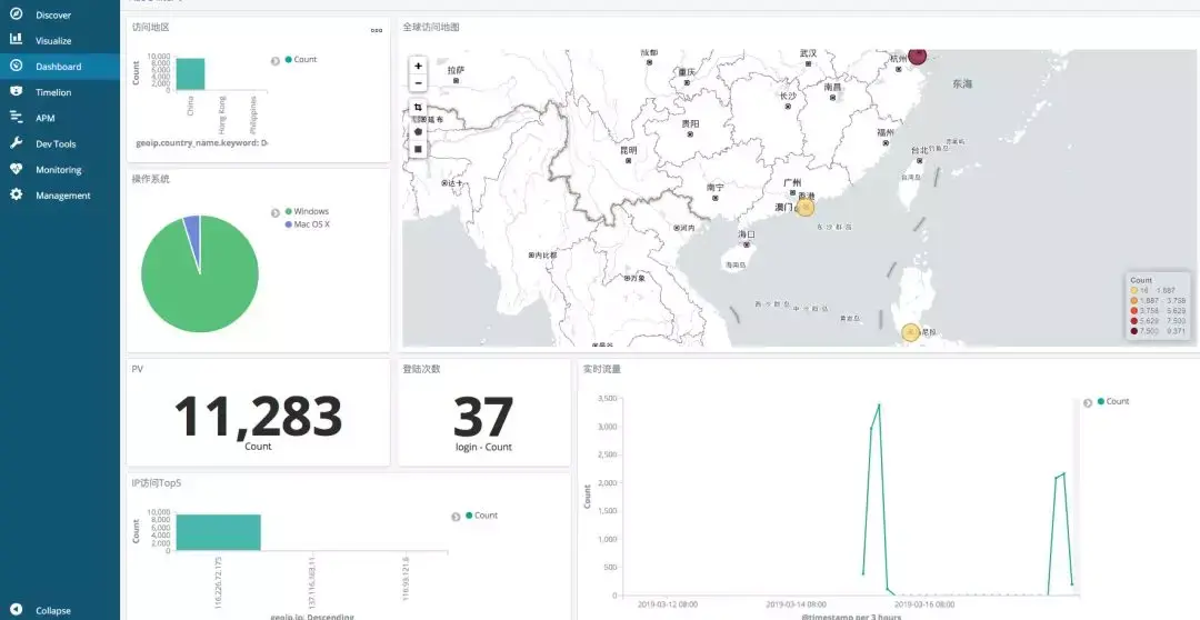 实时流量:根据@timestamp字段来展示单位时间的请求数(可根据异常峰值判断是否遭遇攻击)
