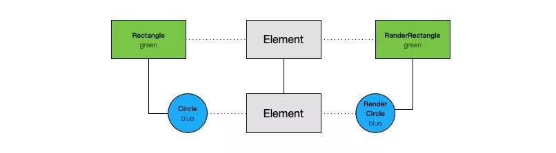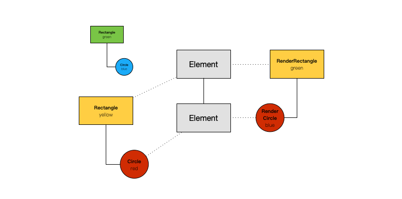 在页面更新重新生成控件树时,RenderObjectElement 树会尽量保持重用。由于 RenderObjectElement 持有对应的 RenderObject,所有 RenderObject 树也会尽可能的被重用。如图所示就是三棵树之间的关系。在这张图里我们把形状当做渲染节点的类型,颜色是它的属性,即形状不同就是不同的渲染节点,而颜色不同只是同一对象的属性的不同。