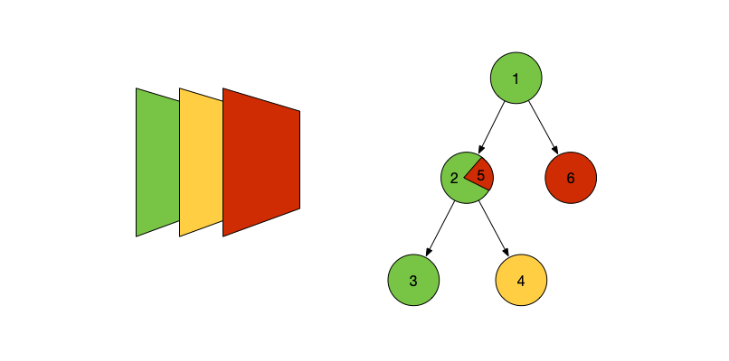 这时有可能出现一种特殊情况,如下图所示节点 2 在绘制子节点 4 时,由于其节点4需要单独绘制到一个图层上(如 video),因此绿色图层上面多了个黄色的图层。之后再需要绘制其他内容(标记 5)就需要再增加一个图层(红色)。再接下来要绘制节点 1 的右子树(标记 6),也会被绘制到红色图层上。所以如果 2 号节点发生改变就会改变红色图层上的内容,因此也影响到了毫不相干的 6 号节点。