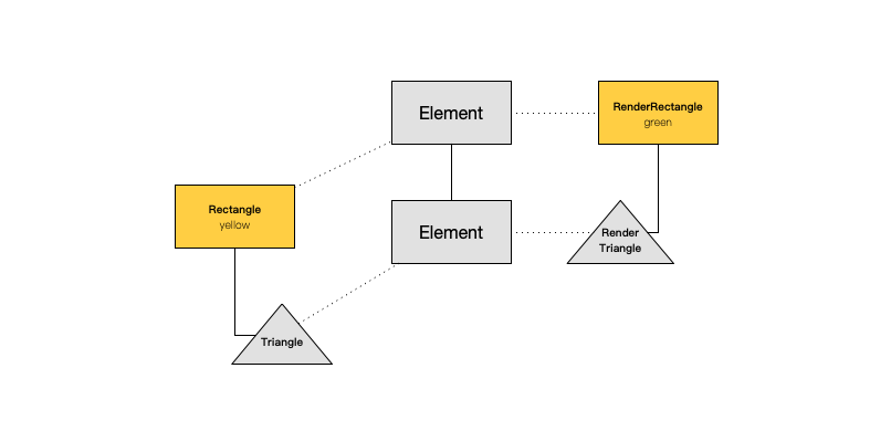 那么如果把红色圆形变成三角形又会怎样呢?由于这里发生变化的是类型,所以对应的 Element 节点和 RenderObject 节点都需要重新创建。但是由于黄色方形没有发生改变,所以其对应的 Element 节点和 RenderObject 节点没有发生变化。