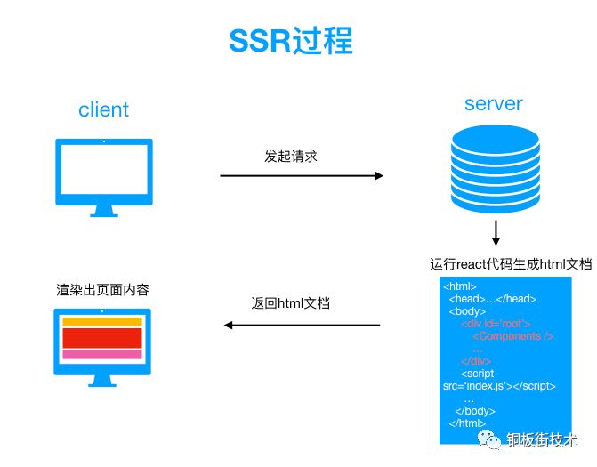 过程:浏览器发送请求 -> 服务器运行 React代码生成页面 -> 服务器返回页面 -> 浏览器下载HTML文档 -> 页面准备就绪即:当前页面的内容是服务器生成好给到浏览器的。
