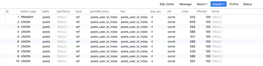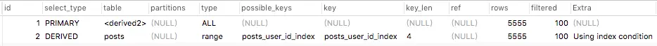 在50w条posts数据时,查询平均耗时 0.002s,算是不错的表现了. Explain如下