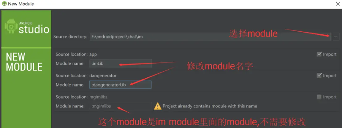 Source direcory选择module,勾选import, Modulename 为module name