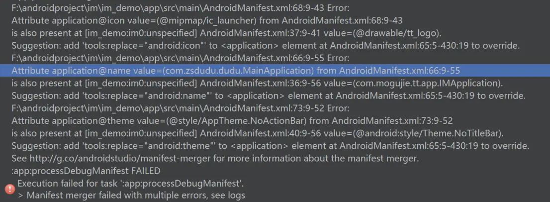 解决:在主工程AndroidManifest文件里面application中加上 tools:replace="android:icon,android:name,android:theme"