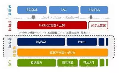 存储层。在这一层,淘宝采用了两个东西,一个使MyFox,一个是Prom。MyFox是基于MySQL的分布式关系型数据库的集群,Prom是基于Hadoop Hbase技术的一个NoSQL的存储集群。