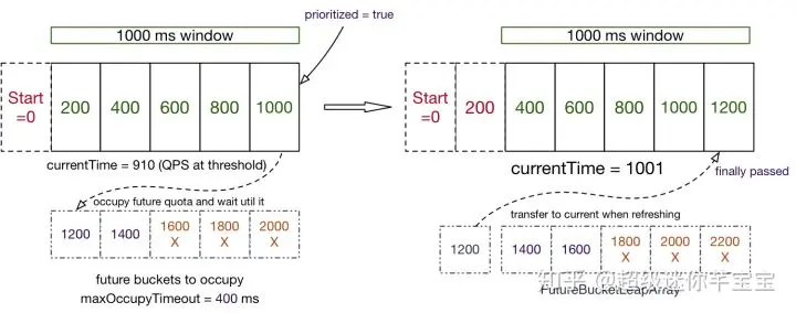 Sentinel 1.5.0 对底层的滑动窗口统计结构进行了升级,添加了“占用”机制,允许在当前 QPS 已经达到限流阈值时,同个资源高优先级的请求提前占用未来时间窗口的配额数,等待到对应时间窗口到达时直接通过,从而可以实现“最终通过”的效果而不是被立即拒绝;而同个资源低优先级的请求则不能占用未来的配额,阈值达到时就会被限流。