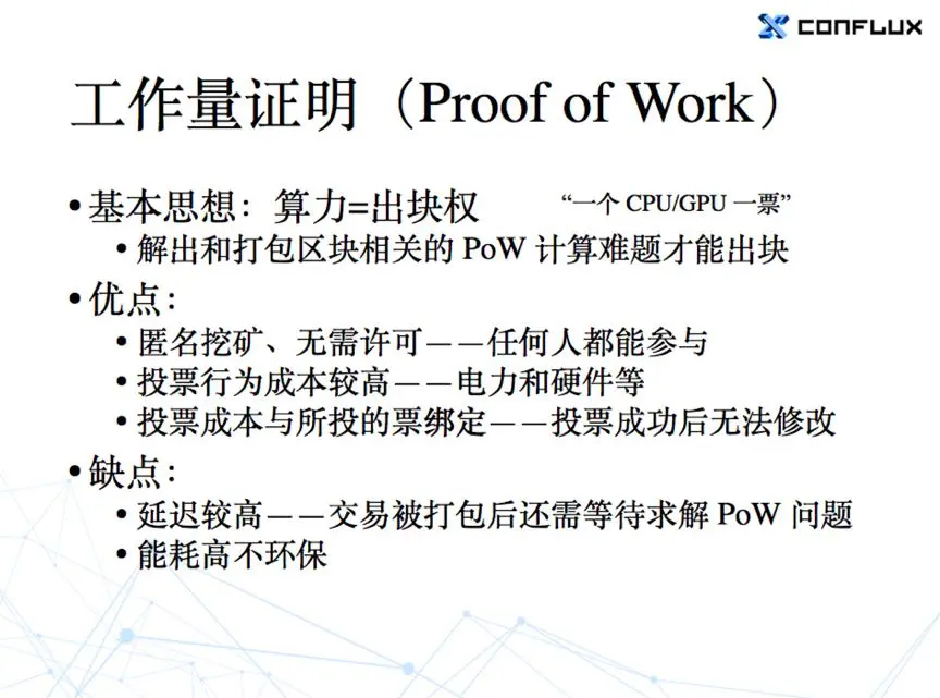 第一个是说确认速度慢。以比特币为例,出一个块平均要十分钟,确认的话还要再等六个块,就平均要一个小时。第二个是吞吐量比较低,大家都很清楚,比特币在这点上已经被人批评好几年了。然后第三点就是能耗高不环保。但是第三点,既然我们要用PoW,这点能耗是避免不了的,所以我们也就不想着去解决这个问题了。