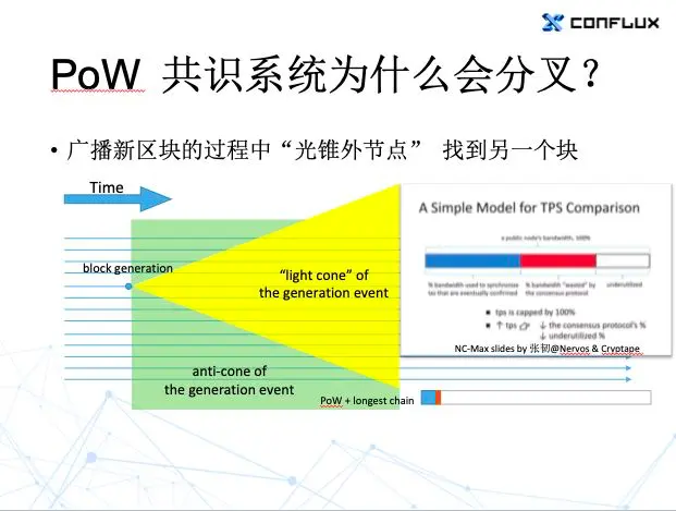 这个也不是的。我们用图里边每条线表示是一个节点,向右的这个箭头表示的是时间。当这个节点产生一个区块的时候,它需要把区块广播出去,但是广播出去要消耗时间,所以会形成一个“事件光锥”。距离产生区块的节点越远,收到广播过去的区块所花的时间也越久,相应的要等到更晚的时间以后才能看到刚才生成的新区块。也就是说只有在这个黄色区域及以后其他的节点才能看到你这边产生的一个区块。既然有光锥,相应的也就有光锥外的区域,也就是图上绿色的部分。当一个节点处在这个光锥外区域的时候,他是不可能知道你这边刚刚产生了一个区块的,因为还没有广播过来。也就是说,如果网络里产生的下一个区块是在后边黄色的这部分,那么当然很安全,因为这个时候所有的节点都看到最新的区块了,然后他们再生产区块都会跟在后面就不会出现分叉——如果大家都是好人的话。