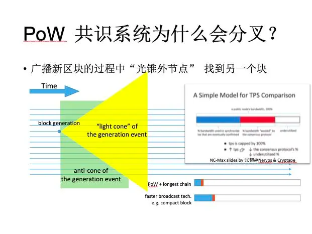 既然这样的话,如果说我们想避免分叉,不可避免的带宽就用不满,带宽用不满的话,TPS就不可能高到哪去。因为你一共同步的数据就那么多,那它里边能放的交易就是有一个上限的——如果交易的尺寸不变的话(交易尺寸缩小也是可以提高TPS的,但是其他所有区块链也可以用同样的技术,相对的劣势依然不变)。