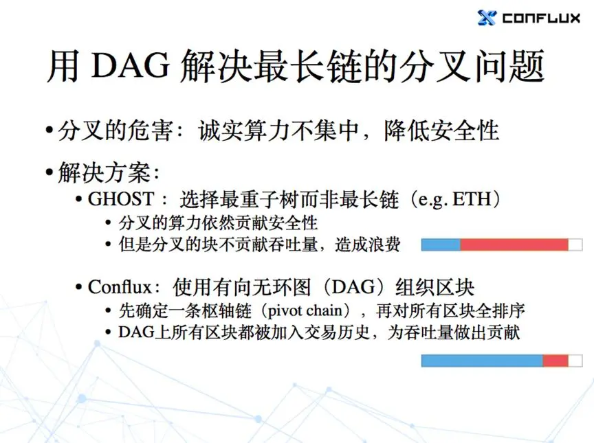 其实刚才要解决的问题,就是说出现分叉以后诚实算力不集中,会降低安全性。但这个解决方案并不是说只有降低分叉概率这一种方案去解决。比如我们也可以用基于 DAG 的有向无环图去解决。