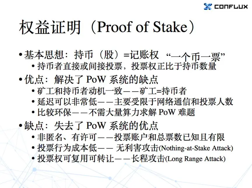 第一,与无许可的 PoW 系统相比,PoS 的系统在匿名性和许可性上稍微差一些。因为我作为一个人,我要加入一个 PoS 的系统,想进去投票,我首先要持有币。这个币我是不可能通过其他方式得到的,我必须跟已经有币的那些人去做交易,他们把币给我以后我才有权利。这就不像 PoW,只要拿一台机器接入系统,就可以直接挖到币。