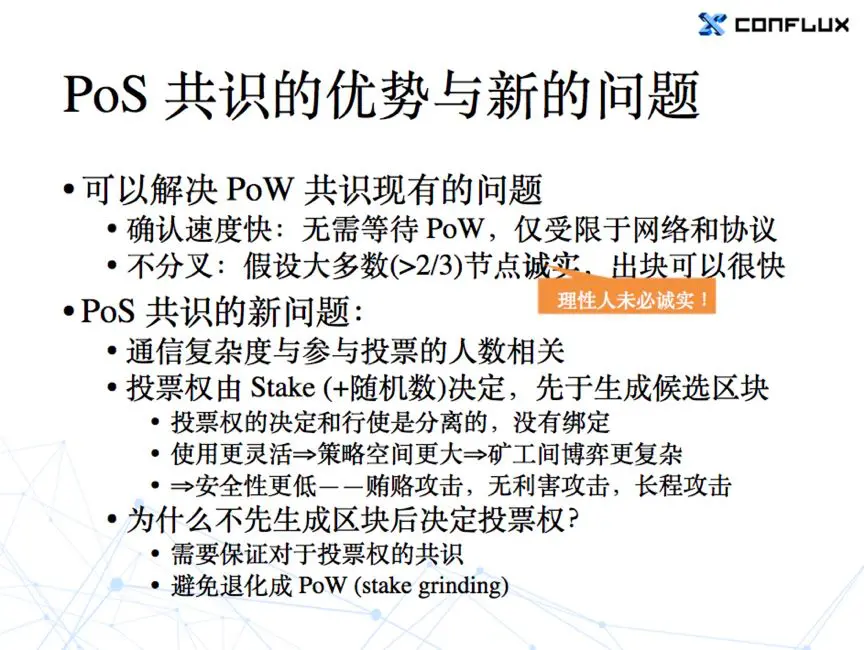 还有一个 PoS 共识的问题,就是需要假设大部分节点是诚实的。“诚实”这件事儿一般是在密码学里边提得多一些。但是在博弈论和经济学里面,很少会说一个人是诚实的,更多是说一个人是理性的——如果说谎可以多赚钱,很多人会选择说谎。所以说,如果假设这些节点都是诚实的,实际上是一个非常强的假设。意味着他们即使能够通过说谎、通过做恶多赚钱,也依然会选择遵守协议。这点还需要看具体协议,对诚实要求到什么程度,才能知道它是不是一个合理的假设。