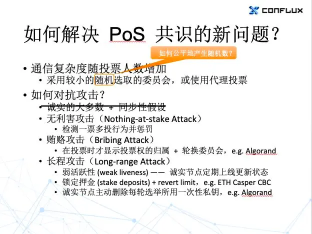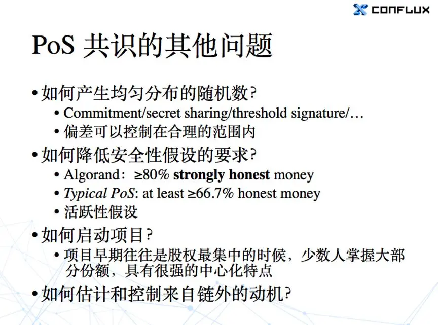 基于 PoS 的共识系统还有一些其他问题。通常我们如果选择一个小的委员会,如果不用 DPoS 的话,在 PoS 系统里我们需要随机地去选。PoW 投票里的随机性主要是由大家分布式并行挖矿时候的运气带来的,因为求解 PoW 问题本身有内在的随机性。但如果说我们要用随机性去选择一个投票委员会的话,就又要解决一个新的问题:怎么样去产生一个公平的随机数?
