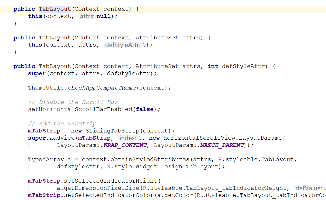 按照我最初的猜想,我以为indicator是一个View什么的,给他设置宽度、高度及颜色就可以显示在文字下方。然而,看了源码后才知道其实并不是这样的。 首先来看看TabLayout是怎么添加Tab的,我们从构造方法开始阅读,放出源码: