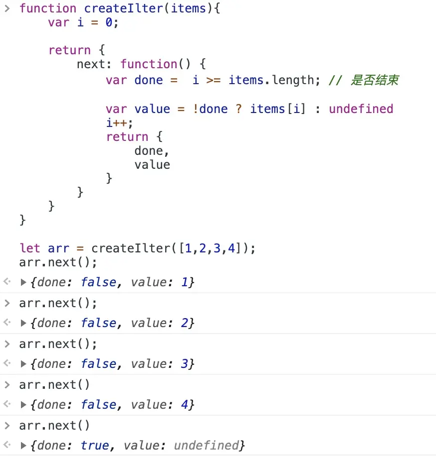 所谓迭代器,其实就是一个具有next()方法的对象,每次调用 next() 都会返回一个结果对象,该结果对象有两个属性,value 表示当前的值,done 表示遍历是否结束。
