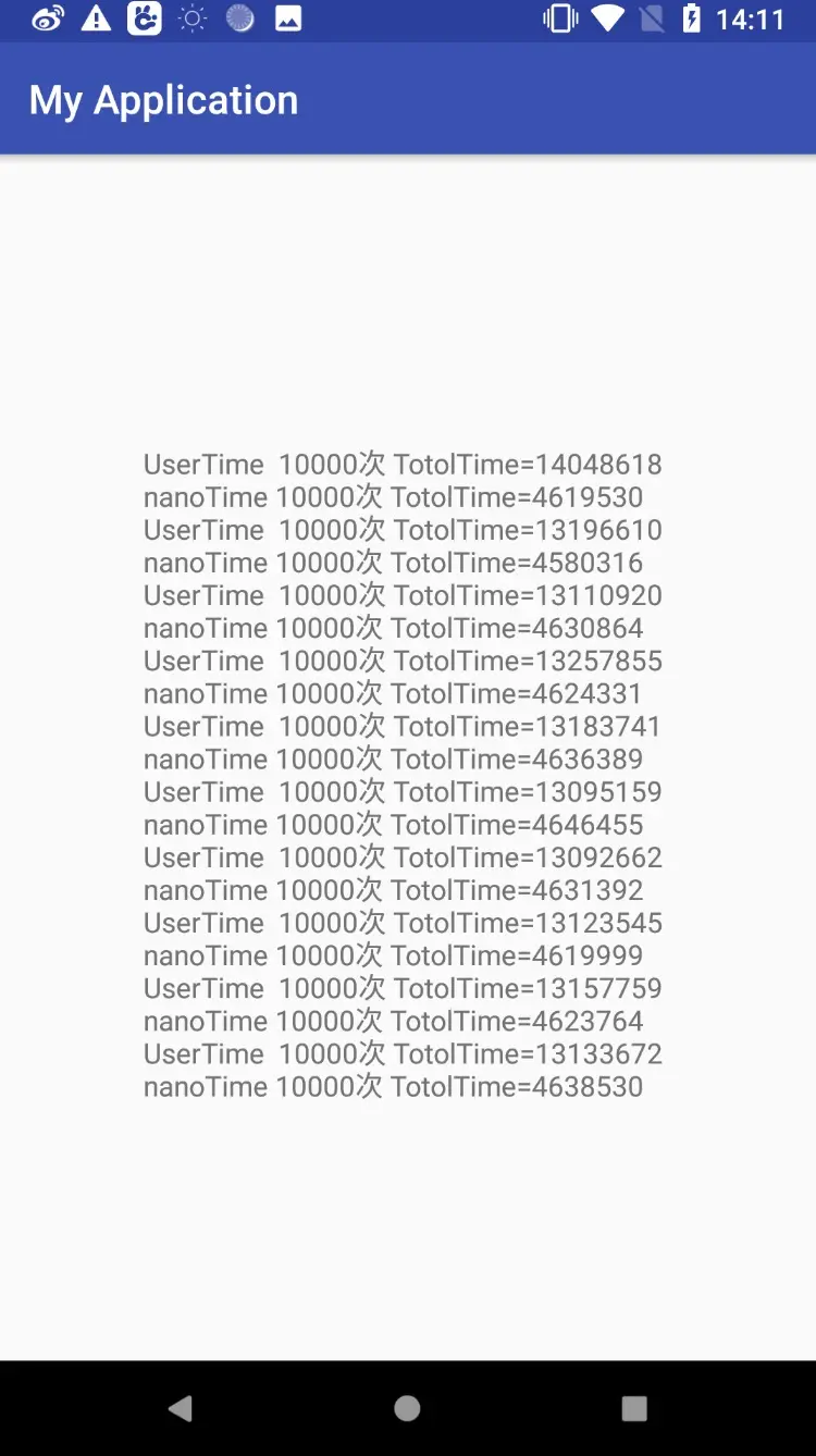 tv.setText(info + "\nUserTime 10000次 TotolTime=" + sum + "\n" + "nanoTime 10000次 TotolTime=" + sum2);