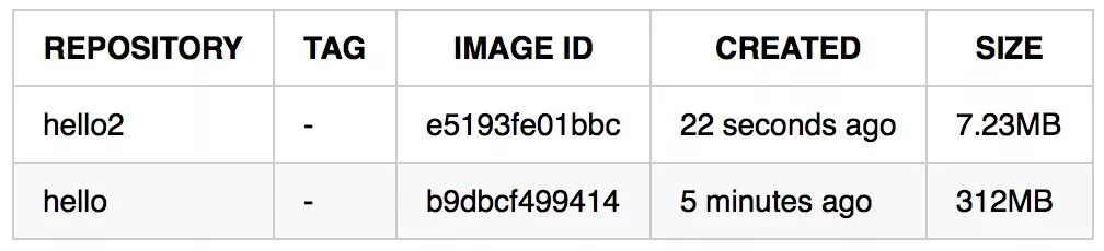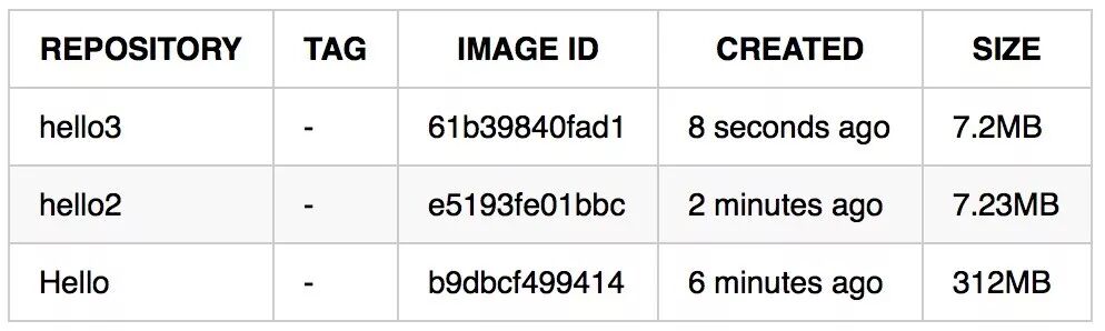 执行docker build -t –rm hello3 .后再执行docker images ,然后我们来看镜像的大小:
