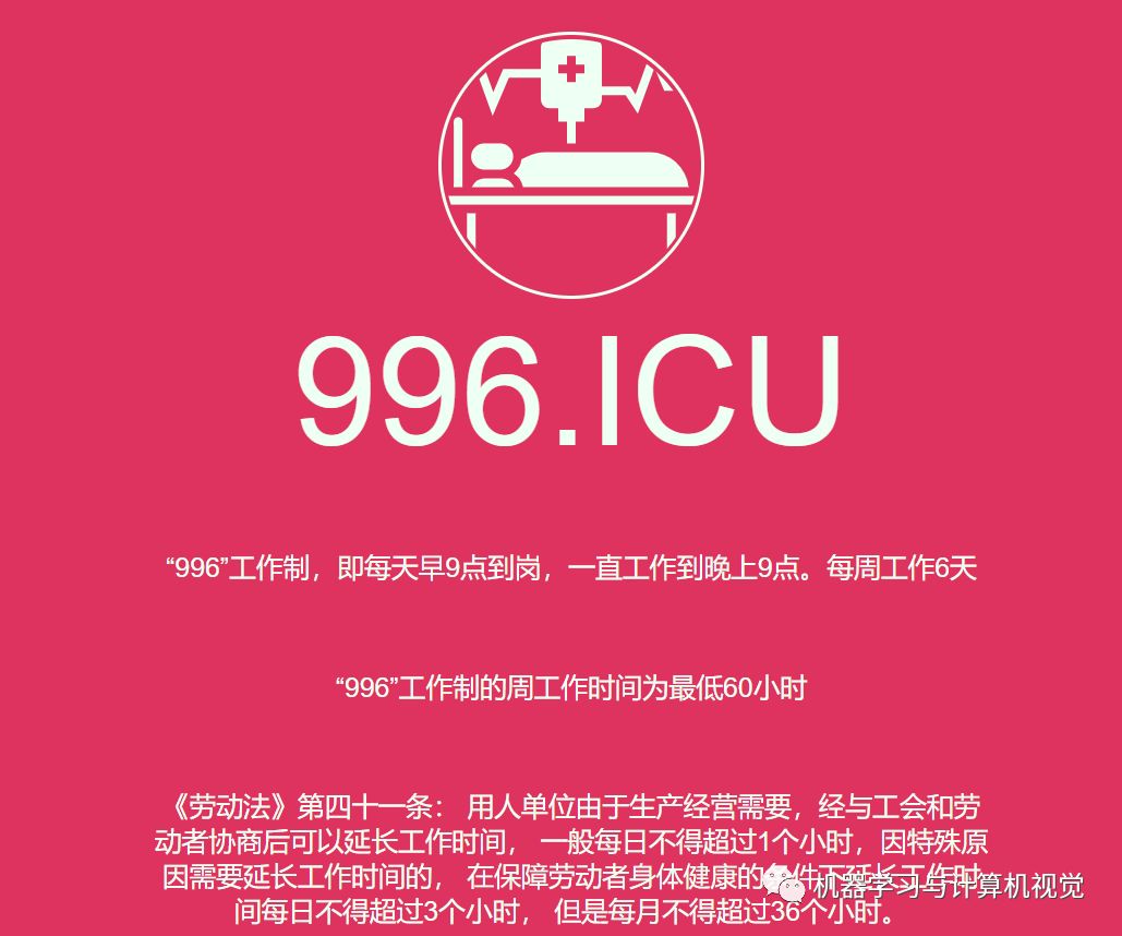 这里简单科普下,996 工作制是指工作日早 9 点上班,晚 上 9 点下班,中午和晚上休息 1 小时(或不到),总计 10 小时以上,并且一周工作 6 天的工作制度。