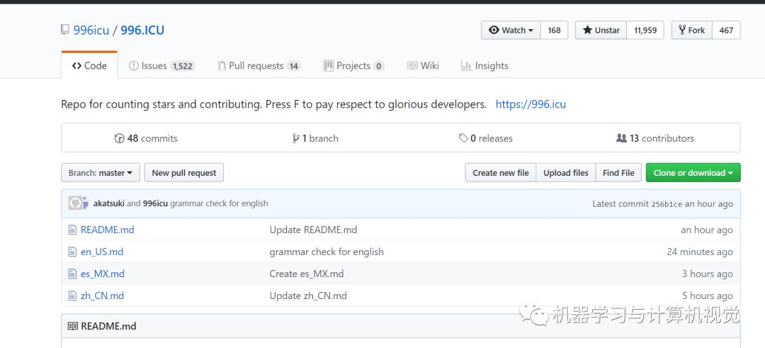 其实昨晚写完文章,就在我的 Githunt 页面上发现这个排在第一位的项目,当时只有 500+ 星而已,点进去发现居然只是个空项目,但是名字非常的引人注目,996ICU,点击这个网站,其实就是一个页面: