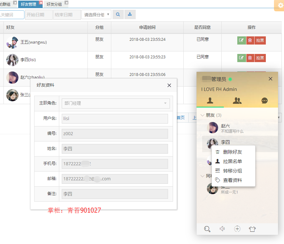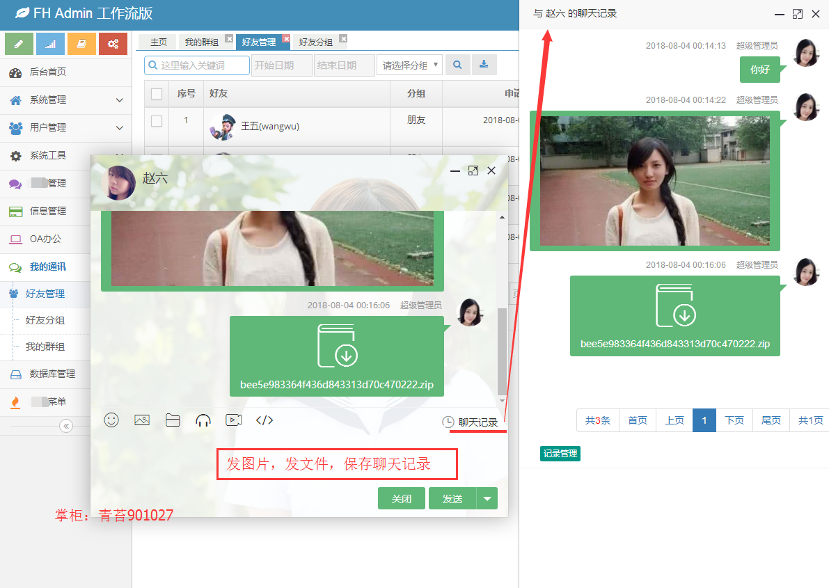 即时通讯:支持好友,群组,发图片、文件,消息声音提醒,离线消息,保留聊天记录