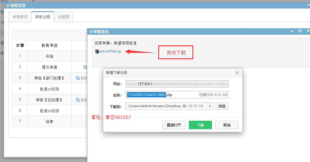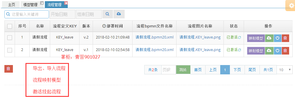 2.流程管理 :导入导出流程资源文件、查看流程图、根据流程实例反射出流程模型、激活挂起