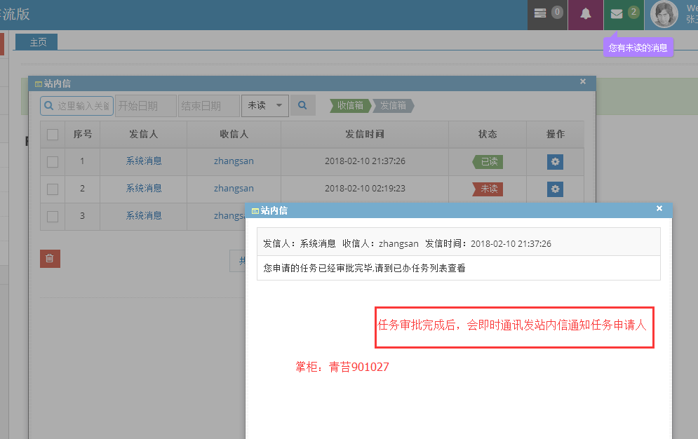 当办理完当前任务时,下一任务待办人会即时通讯收到新任务消息提醒,当作废和完结任务时,
