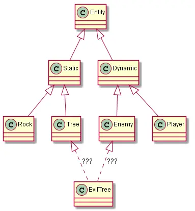 一般来说,我们实现游戏实体都是采用面向对象的方法进行编程。每一个实体都是一个对象,并且需要一个基于类的实例化系统,允许实体通过多态来扩展。但是,这样的方法,往往导致系统中出现大量的类,造成类爆炸的情况出现。随着新的实体出现,我们发现很难在类继承图中添加新的实体,特别是当这个实体需要很多不同类型的功能的时候。你可以看下下面的一个简单的类图继承。一个静态的敌人,并不能够很好的继承出来。