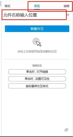 设置元件名称:选中元件,然后在右侧的交互/说明选项卡的文本框中输入名字。名字有什么用呢,就是我们看到这个元件知道其是什么,见名知意。如图2-2
